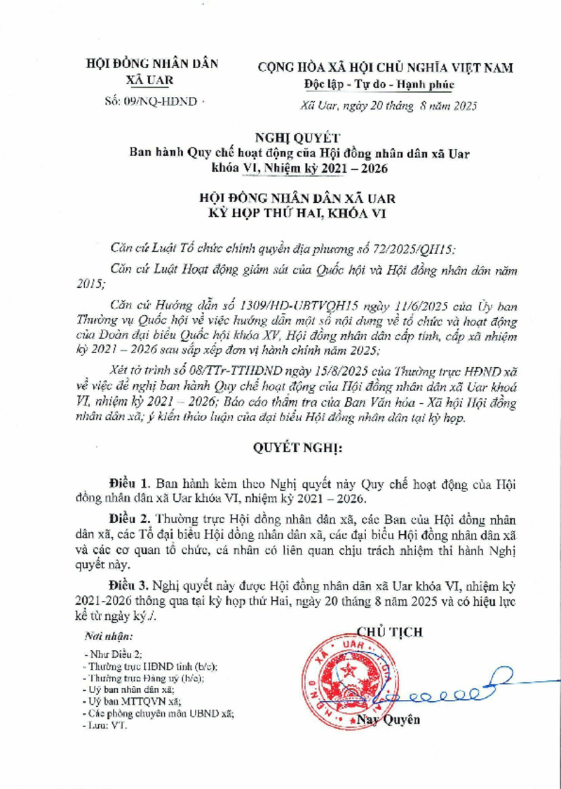 Tiêu đề văn bản | Nghị quyết số 09/NQ-HĐND Về ban hành Quy chế hoạt động của Hội đồng nhân dân xã Uar khóa VI, nhiệm kỳ 2021 – 2026 | ||